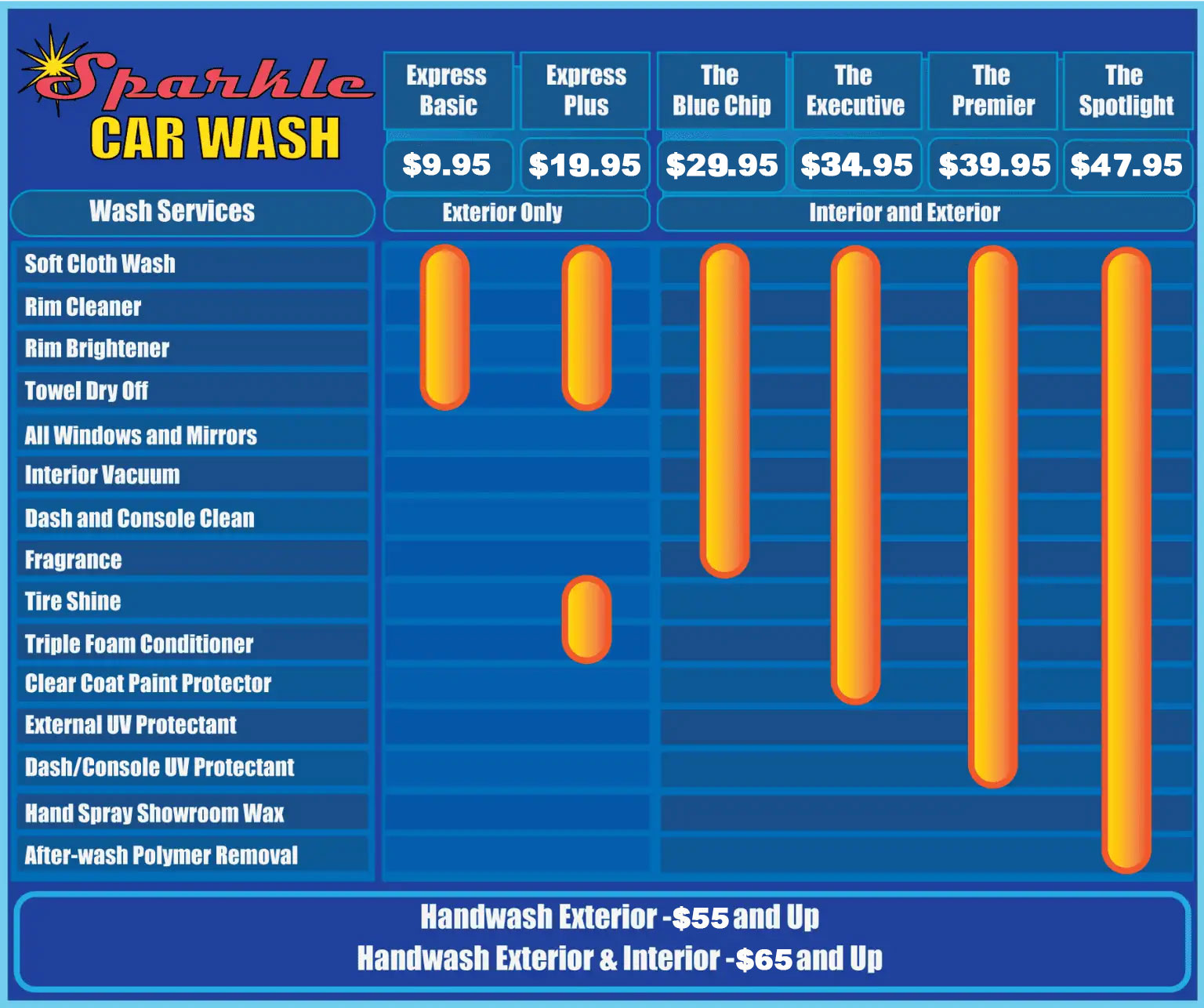 Sparkle Car Wash offers Express, Full-Service, and Detail auto styling services. Our complement of choices can be tailored to meet most any need. Our team draws on decades of experience, using top-of-the-line chemicals to ensure a deep, rejuvenating clean.